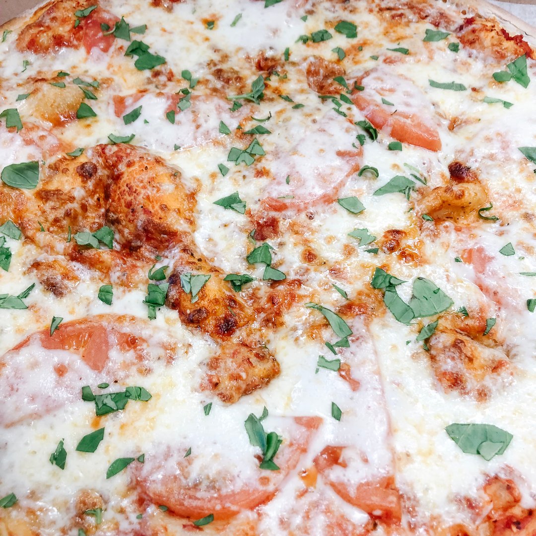 Green peppers, pepperoni, mushrooms, bacon, green olives & onions.
